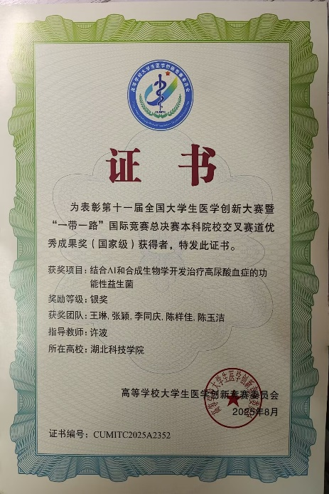 在第十一届全国大学生医学创新大赛暨“一带一路”国际竞赛中,学院师生表现尤为亮眼。由周慧芬、晏彪老师指导,2023级眼视光医学郭行健同学负责的项目《基于CRISPR-cas12a系统的KRAS基因精准诊疗体系构建研究》荣获国家金奖(最佳团队合作奖)及省级一等奖;由许波老师指导,2022级口腔医学王琳同学负责的项目《结合AI和合成生物学开发治疗高尿酸血症的功能性益生菌》项目荣获国家级银奖及省级一等奖;由黄彬、陈黄琴老师指导的项目《锰基纳米酶化学动力治疗口腔鳞状细胞癌的机制:线粒体自噬》获省赛二等奖;由刘毅飞、周燕红老师指导,2023级眼视光医学专业张乐天负责的项目《补骨脂乙素靶向PARP1抑制细胞焦亡缓解溃疡性结肠炎的机制研究》获复赛三等奖;由包永芬、单士刚老师指导,2023级临床医学(眼耳鼻喉方向)王彬羽负责的项目《黄芩素调控类风湿性关节炎和炎症相关机制研究》获省赛三等奖,此外,多个项目在省级赛中获优秀奖,涵盖口腔医学、眼视光医学、基础临床、交叉学科等多个赛道。