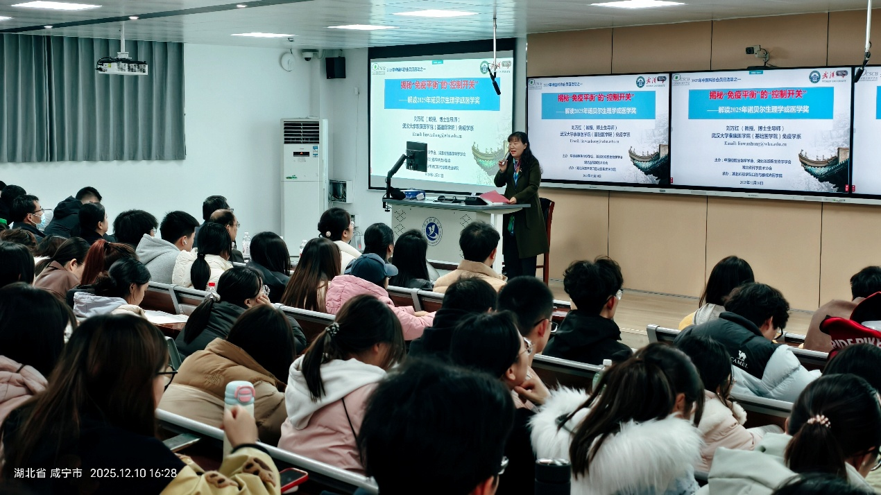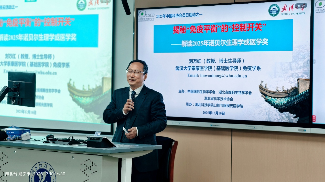 2025年12月10日下午,由中国细胞生物学学会指导,湖北省细胞生物学学会与bbin宝盈联合举办的“揭秘‘免疫平衡’的‘控制开关’——2025年诺贝尔生理学或医学奖解读”科普讲座在我校成功举行。武汉大学泰康医学院(基础医学院)免疫学系刘万红教授担任主讲,湖北省细胞生物学会副理事长李文化教授代表学会出席活动,bbin宝盈院长周燕红教授主持讲座。