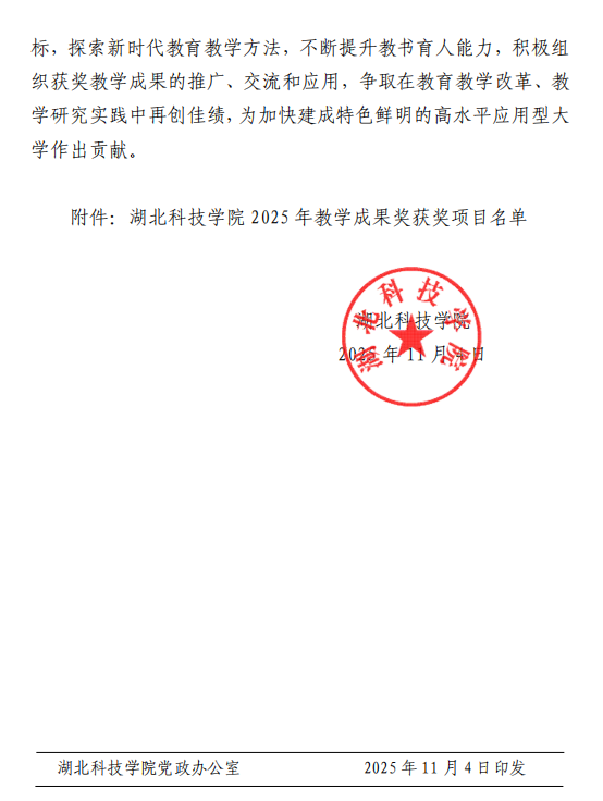 关于公布湖北科技学院2025年教学成果奖评选结果的通知